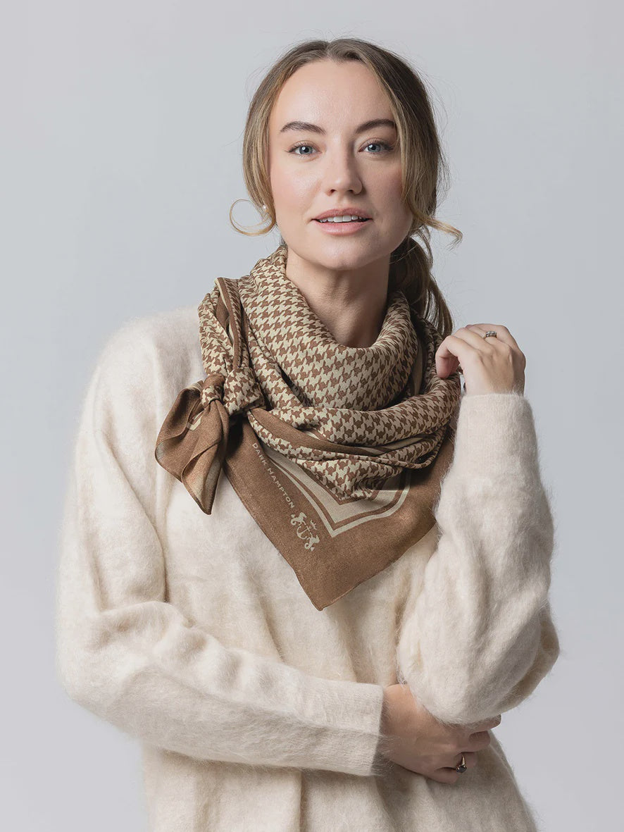 The Dennison features a classic brown and tan houndstooth design, offering timeless style with a modern edge. Lightweight, soft, and effortlessly versatile.