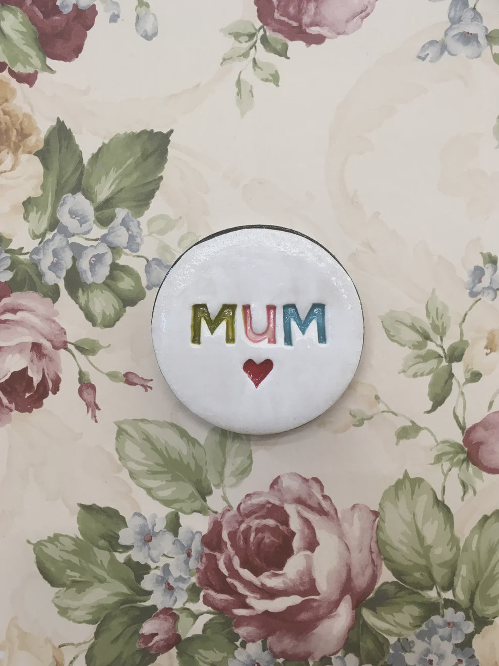 A circular tile is glazed in a soft white and stamped with our handmade alphabet spelling 'Mum ' finished with a contemporary palette and bordered with a black edge .
